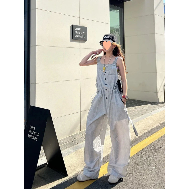 韓国風シンプルストライプカジュアルサスペンダーワンピースパンツ女性用2025夏人気ニッチデザインロングパンツ