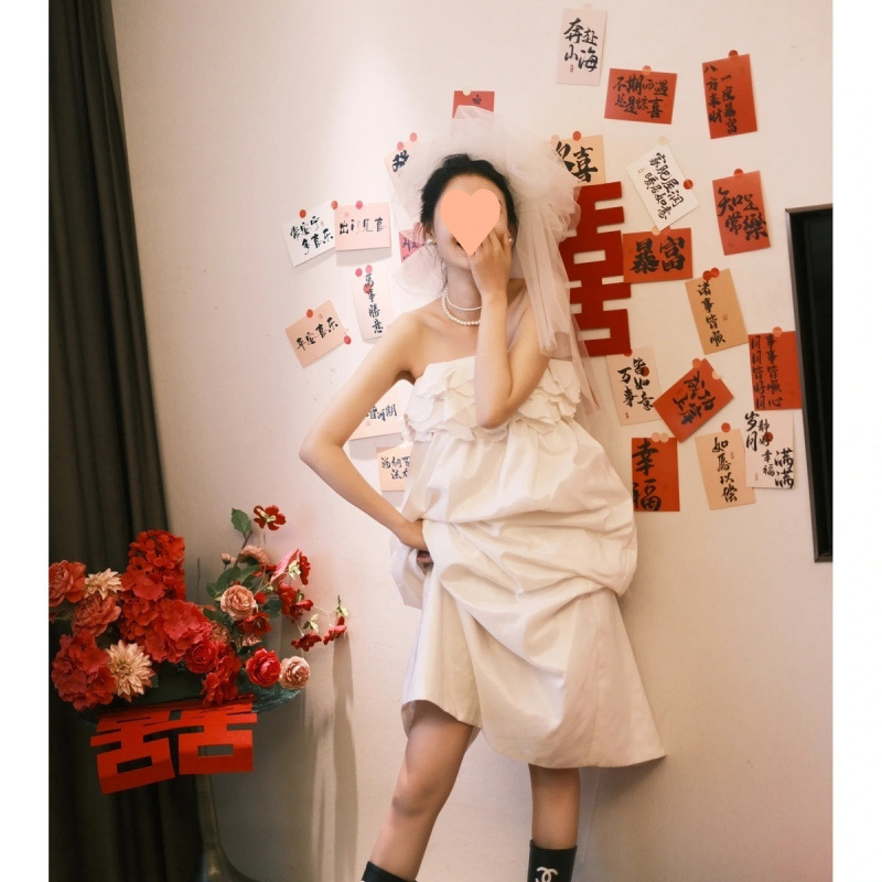 フレンチレトロサテンブライダルウェディングドレスドレッシングローブチューブトップワンショルダーマタニティライトウェディングドレス写真撮影服