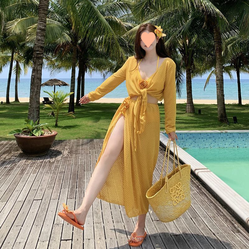 プラスサイズの太ったスプリット水着、フェミニンなビキニ4点セット、ハイエンドのホットガールビーチロングスカート、海辺での休暇