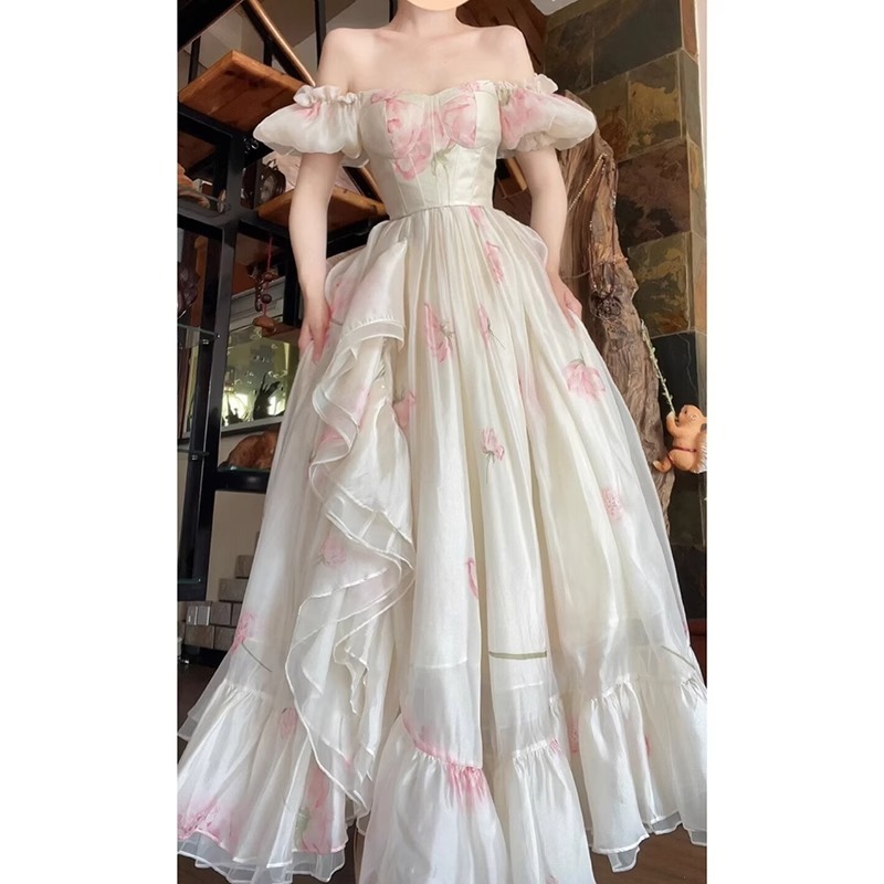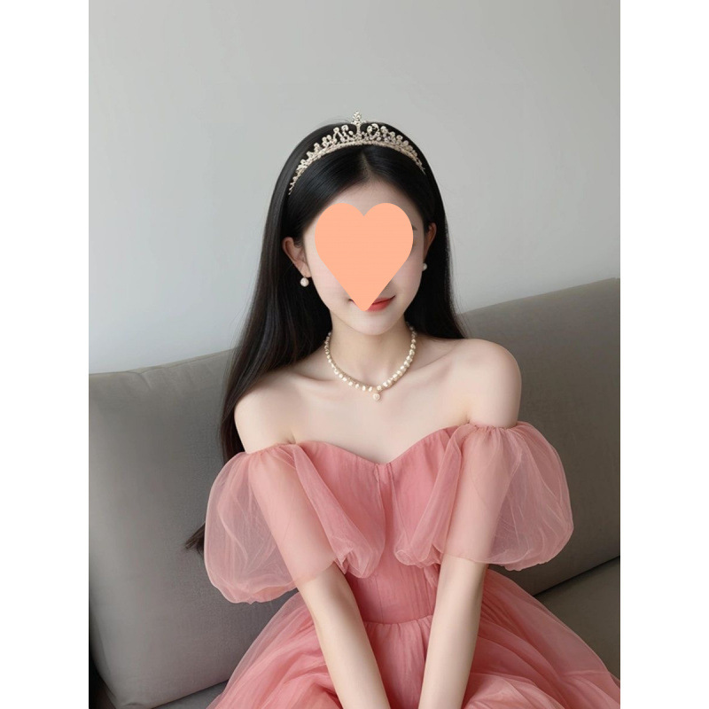 小柄な方向けのピンクのワンショルダーチューブトップパフスリーブ南仏リゾートスタイルニッチデザインドレス