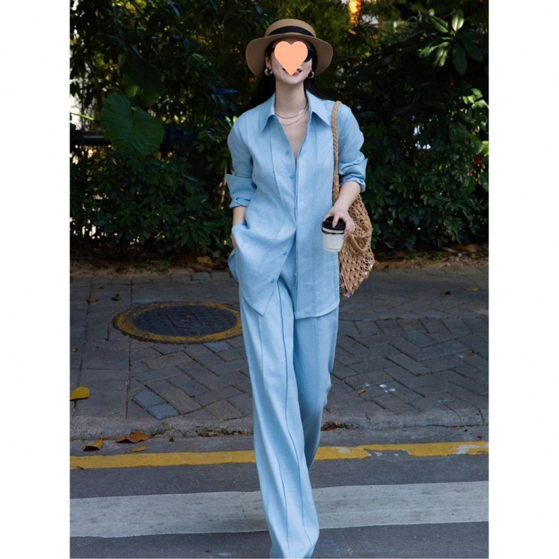 オールドマネースタイル ライトブルー 万能スーツ レディース 春夏新作 リラックス長袖シャツ ワイドパンツ シンプル 2点セット