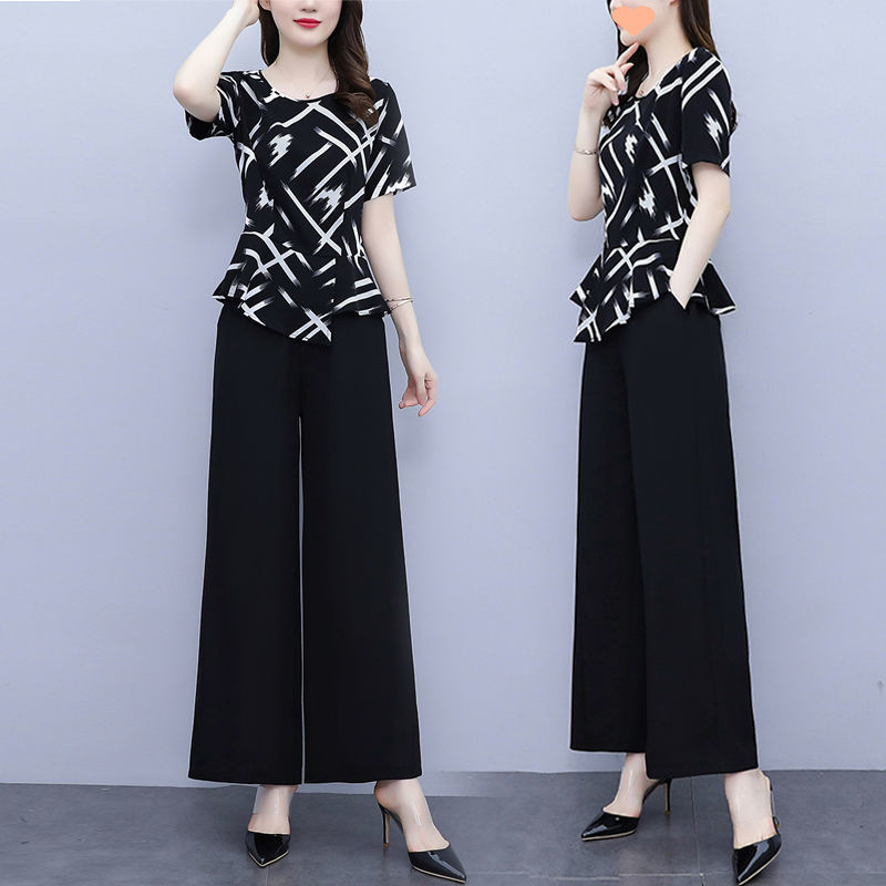 西洋風年齢軽減ストライプワイドレッグパンツスーツ女性の夏服2025新しいファッション中年母親痩身2点セット