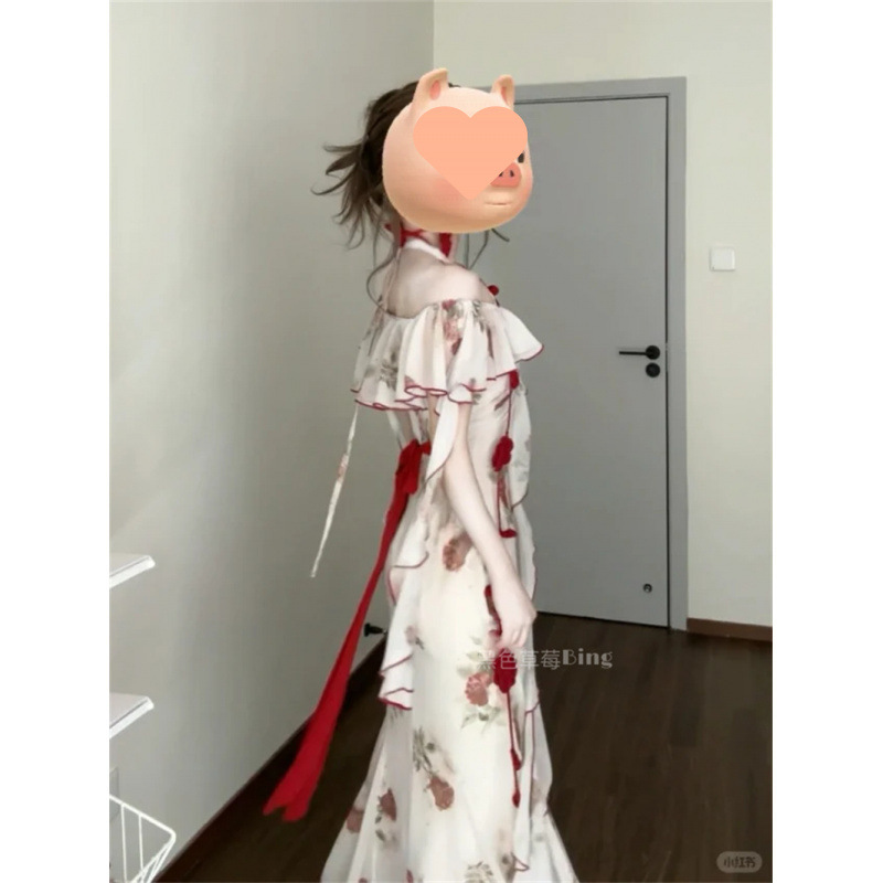 フレンチレトロな気質の花柄ワンショルダーリボンドレス女性の夏のウエスト痩身フィッシュテールヒップロングスカート