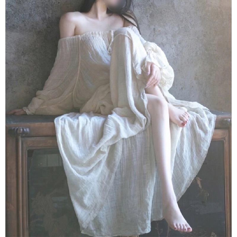 禅風ワンショルダー鎖骨露出ゆったりブラウス、モーニングローブスカート、涼しげで妖精のような雰囲気のフロアレングスドレス