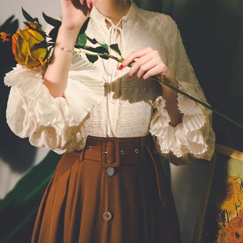フレンチデザイン「キャラメルラテ」フレンチレトロヘップバーンハイウエストレースアップロングスカートレディーススカートシャツ