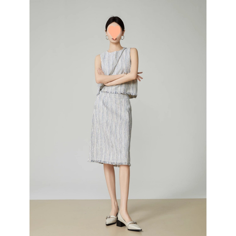 Xiaoxiangfeng スタイルスーツ女性のための 2025 夏の新しいスタイルのテクスチャード起毛タッセルベストトップスカート 2 点セット