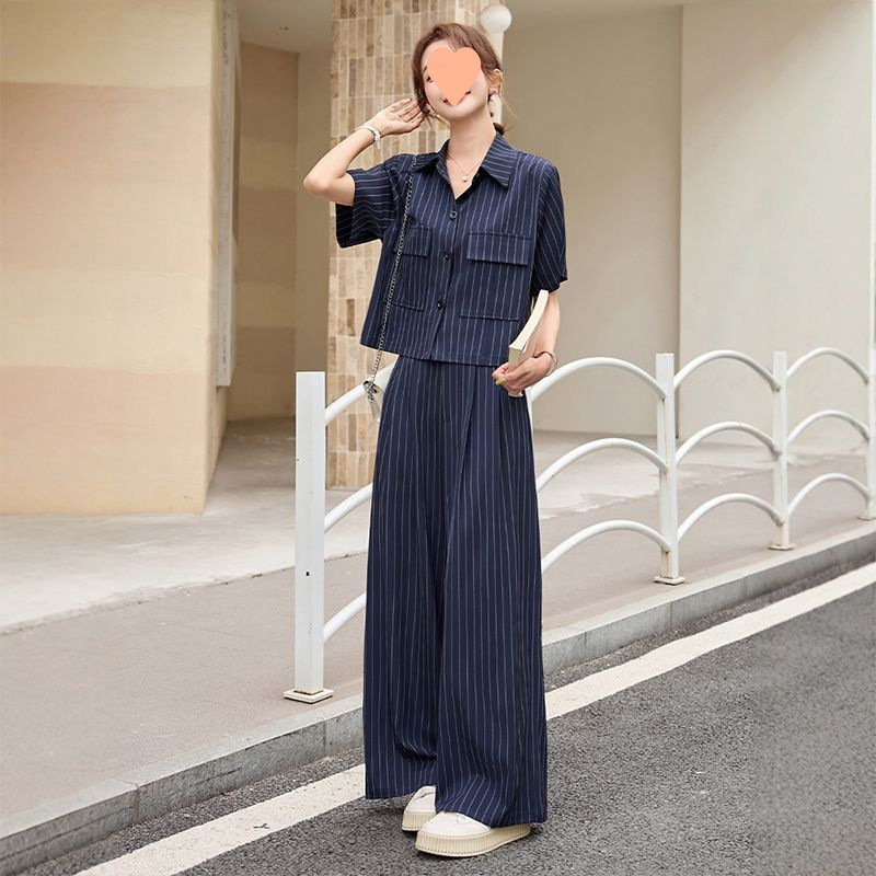 カジュアルファッションプロフェッショナルスーツ女性のための 2025 夏の新しいスタイルハイエンド西洋スタイル見栄えの良いストライプワイドレッグパンツ 2 点セット