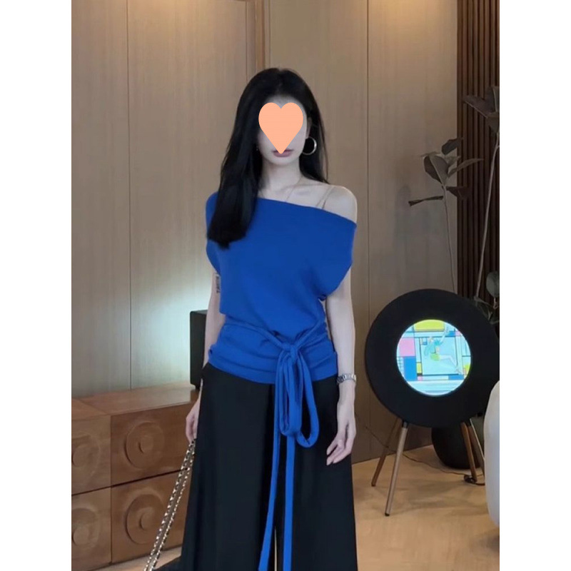 クラインブルー不規則なレースアップショート甘辛トップ女性の夏のワンショルダーアイスシルクニット半袖Tシャツ