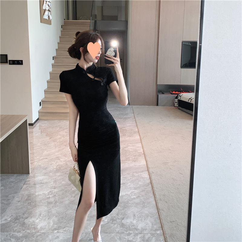 中華民国風改良チャイナドレス、ミドル丈、スリムフィット、スリムフィット、セレブスリット、セクシーな膝上ドレス