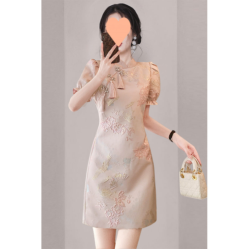 新しい中国風のエレガントな痩身改良されたチャイナドレス 2025 夏の新しい女性のエレガントな知的パフスリーブ A ラインスカート