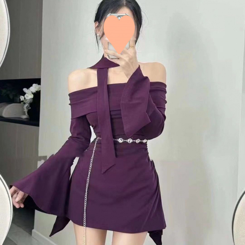 2025 新しい秋長袖フレンチピュア欲望ワンラインセクシーなトランペットスリムパープルドレスリボンショートスカート