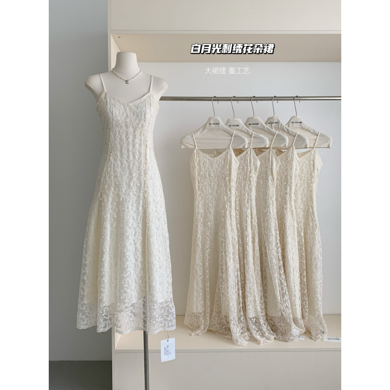 夏の女性向けのフレンチ刺繍レースウエストサスペンダードレス、優しくエレガントな気質