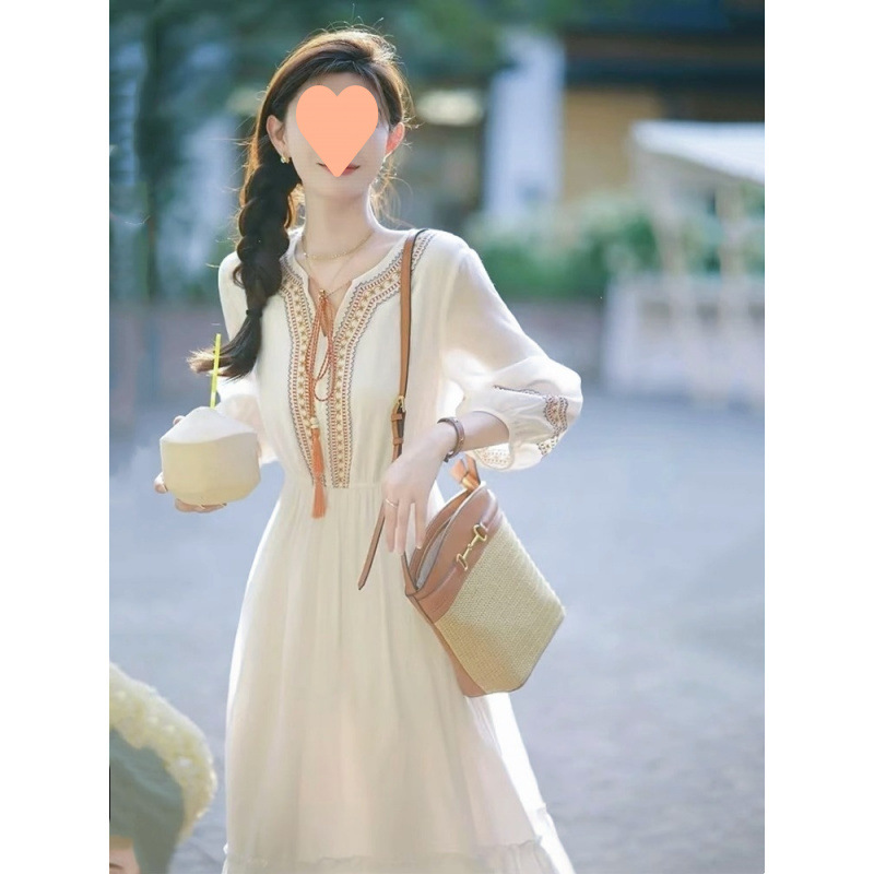 ボヘミアン七分袖ドレスエスニックスタイル刺繍ファッションホリデードレスニッチタッセルレースデザイン