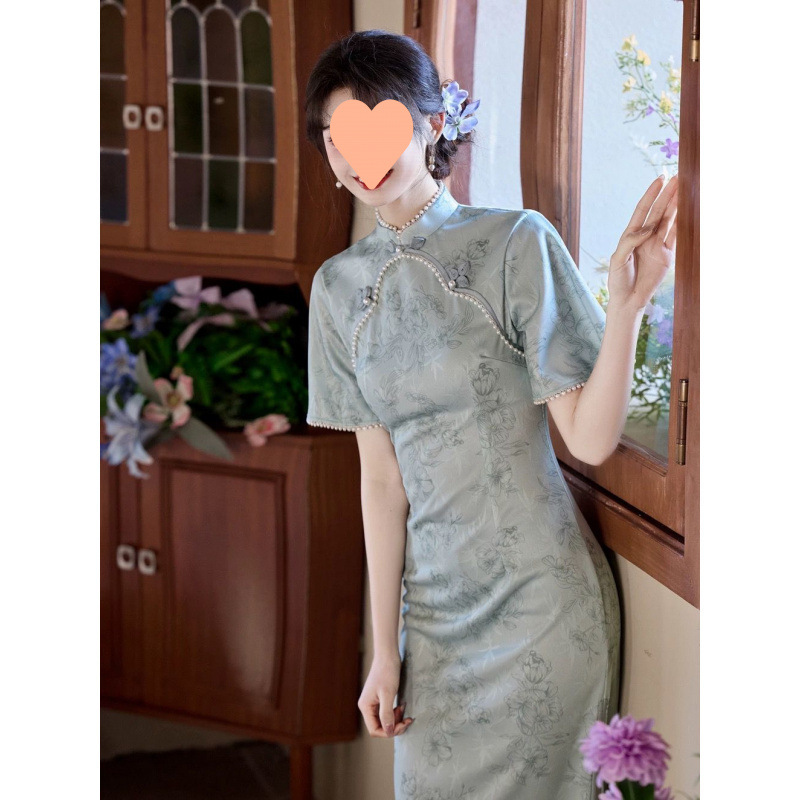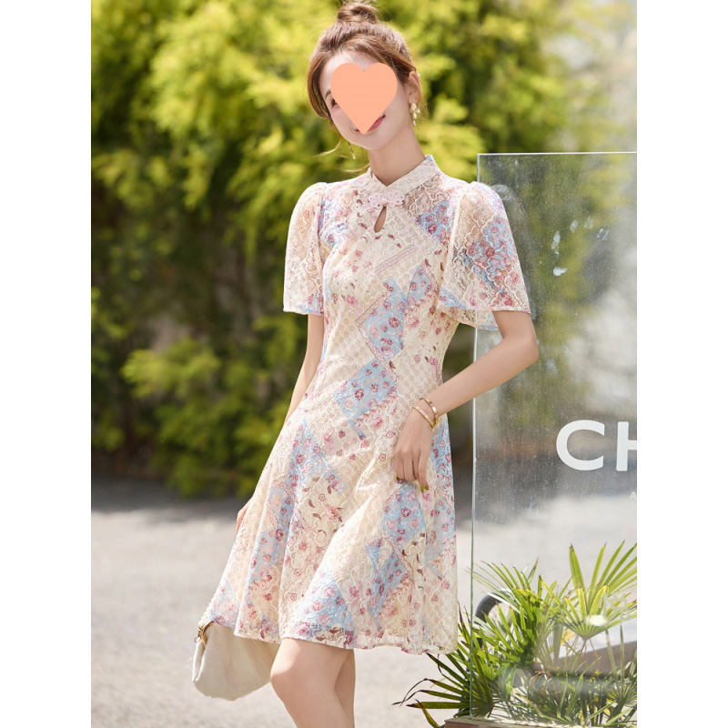 新しい中国風の改良されたチャイナドレスレースドレス女性のための 2025 夏の新しいスタイルのスリムプリントスカート