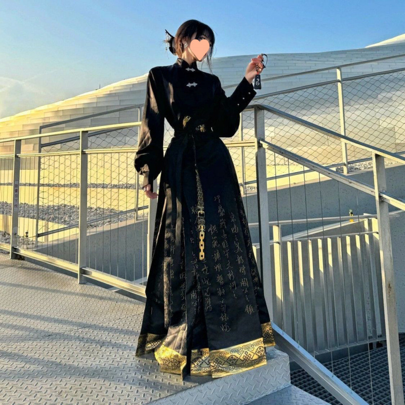 デイリー滕王閣通勤漢服スーツ25中国風改良国民風スタンドカラーマンティーンブラックハーフレングス2点セット