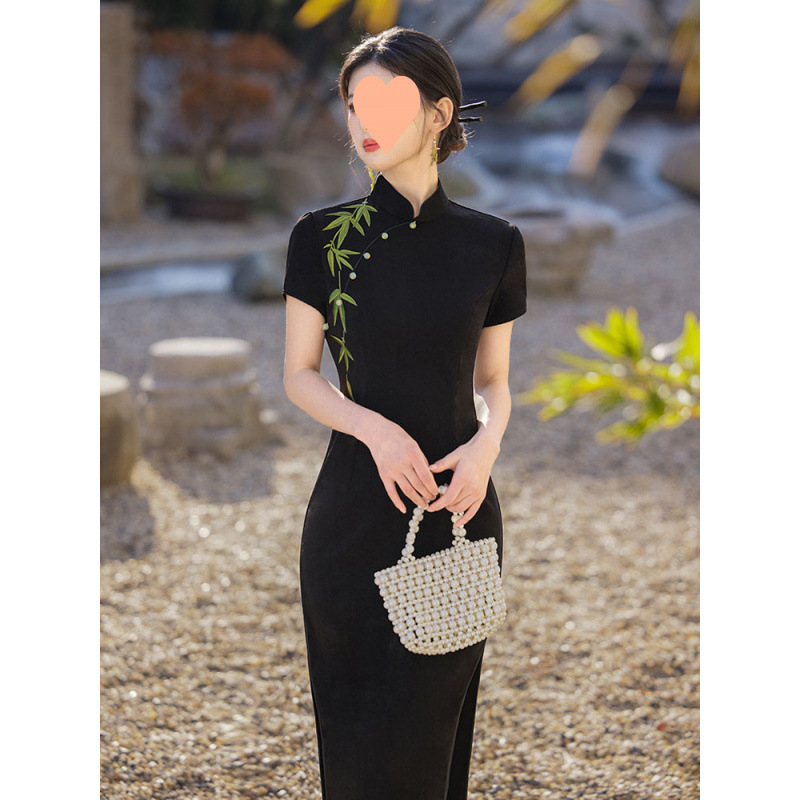 2025 新改良チャイナドレス黒新中国風の若いスタイル日常着用気質ハイエンドレトロ刺繍竹の葉