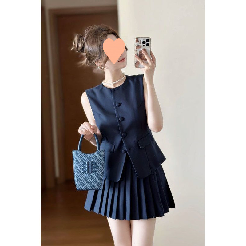 Xiaoxiangfeng ノースリーブスーツベストスーツスカート女性のための 2025 夏ハイエンドプチプリーツスカート 2 点セット