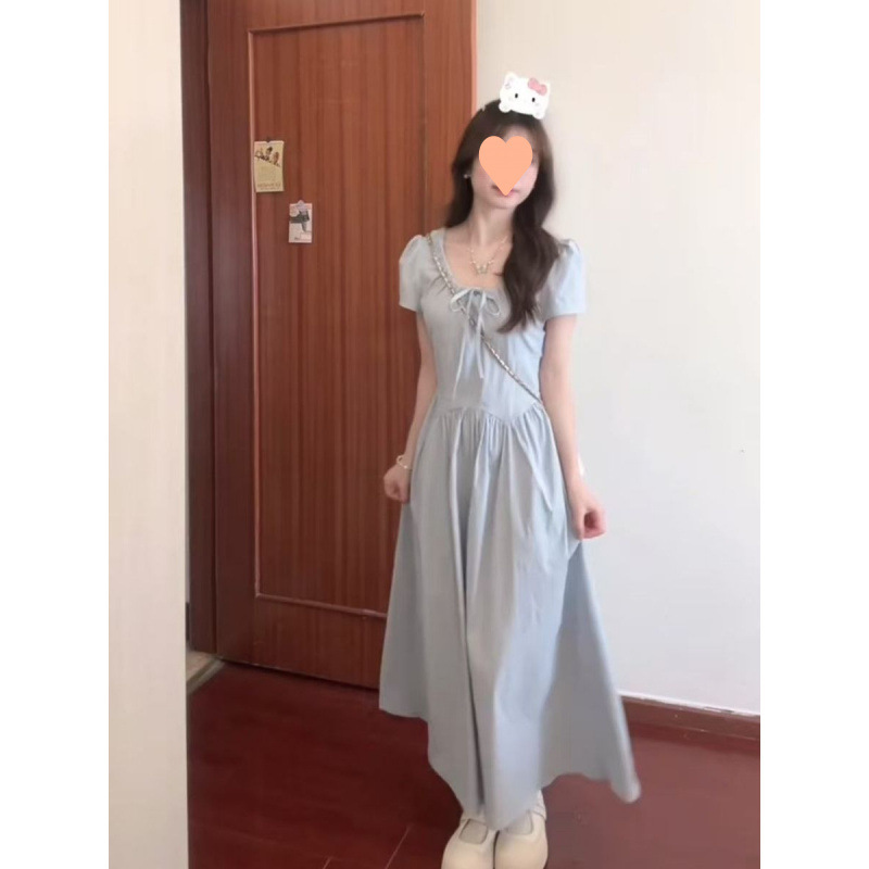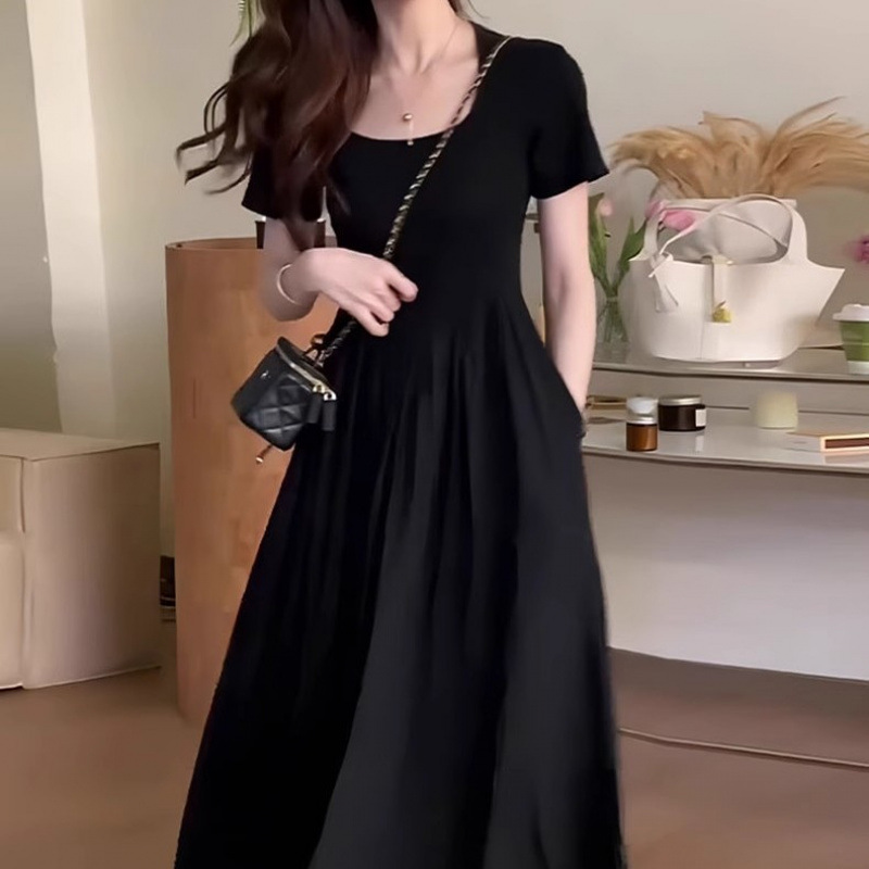 新しいフレンチサマーヘップバーンロングスカートドレススクエアネックスリム半袖気質ウエストブラックデザインスカート