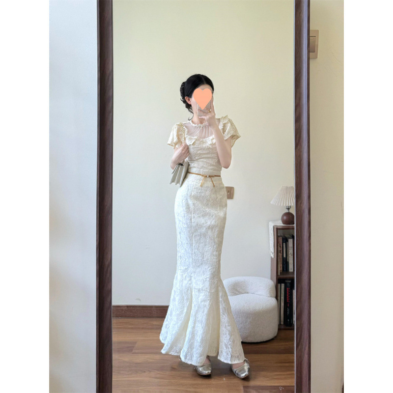 フレンチスタイルセレブフリルスリムトップ夏の新しいハイウエストスリムフィッシュテールスカート女性用2点セット