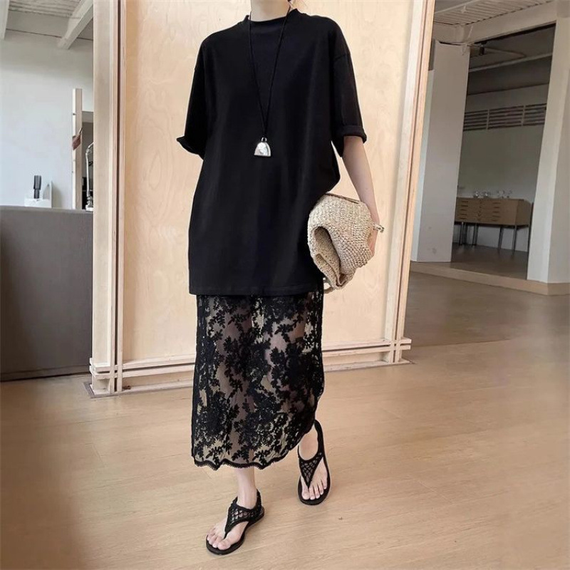 レトロ韓国風ゆったり大きいサイズMM半袖Tシャツトップス気質春新作レーススカート2点セット女性用