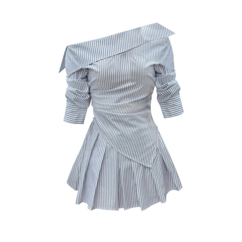 新しい夏のニッチデザインの優しいスタイルのスーツ、少し太ったハイウエストストライププリーツスカート+ラペルオフショルダートップ