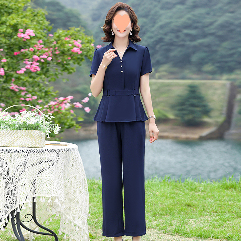 ママの2025年新作おしゃれ年齢軽減スーツ中高年女性のおしゃれな夏服シフォン半袖トップス2.5kg点セット