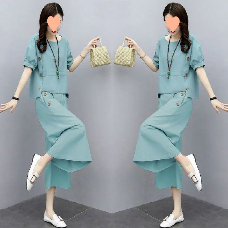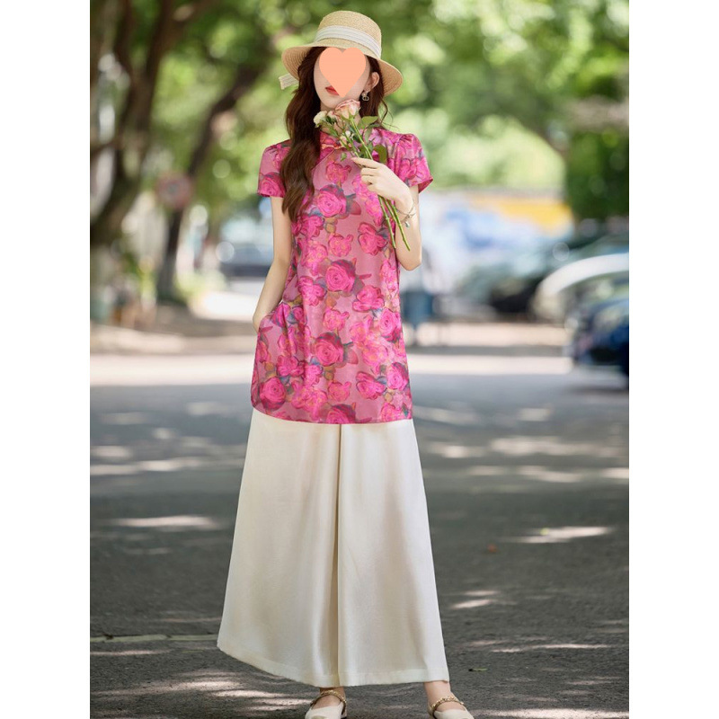 新しい中国風の女性用スーツ、2025年夏の新しいスタイル、超妖精で見栄えの良いプリントベリーカバートップ、ワイドレッグキュロット2点セット