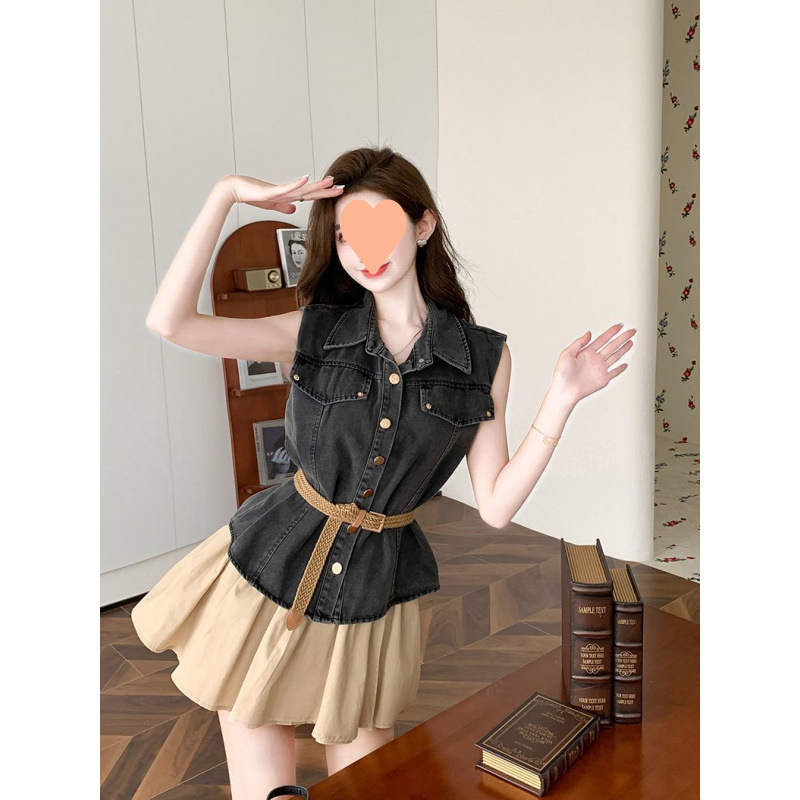 香港スタイルの人気の衣装、レトロなポロカラーデザインのノースリーブデニムベストの女性のスリムスカートの完全なセット