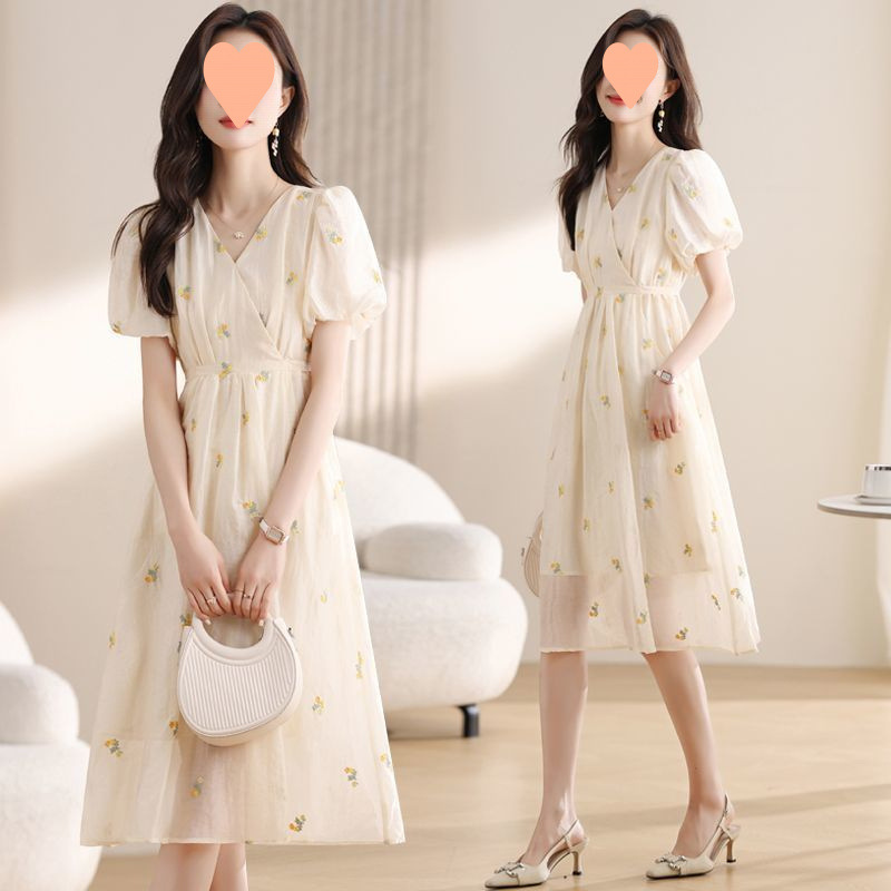 マルベリーシルクフレンチフローラルドレス夏の新しい気質スリムレースアップウエストパフロングスカート刺繍スカート