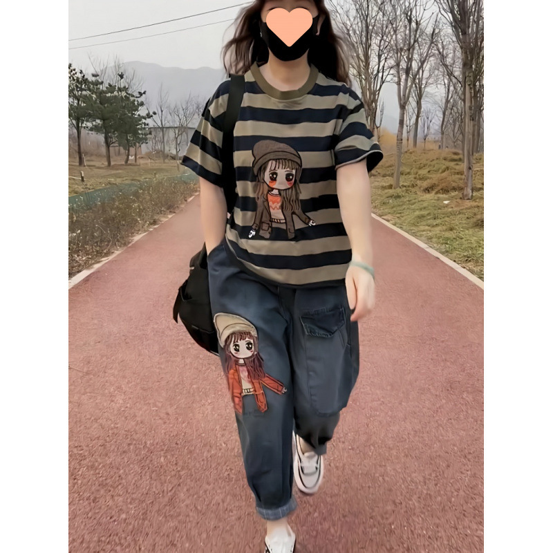 ツーピーススーツ女性 2025 夏の新しい女の子パッチ刺繍ストライプ T シャツ + 水