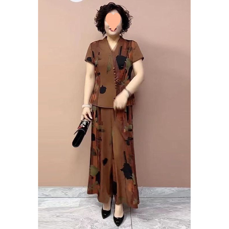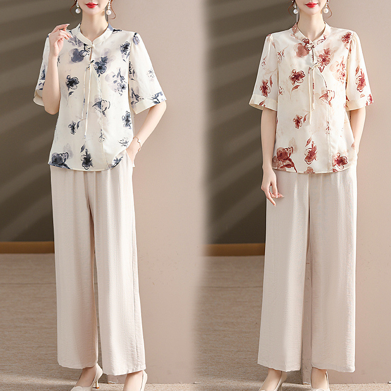 新しい中国風中年女性の夏服新しいカジュアルスーツ外国風中高年母親のシフォンシャツ2点セット
