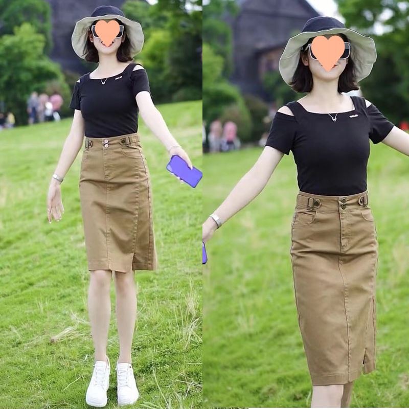 おしゃれな年齢軽減スーツ女性用2025年夏新作スリムオフショルダー半袖Tシャツ+デニムスカートカジュアル2点セット