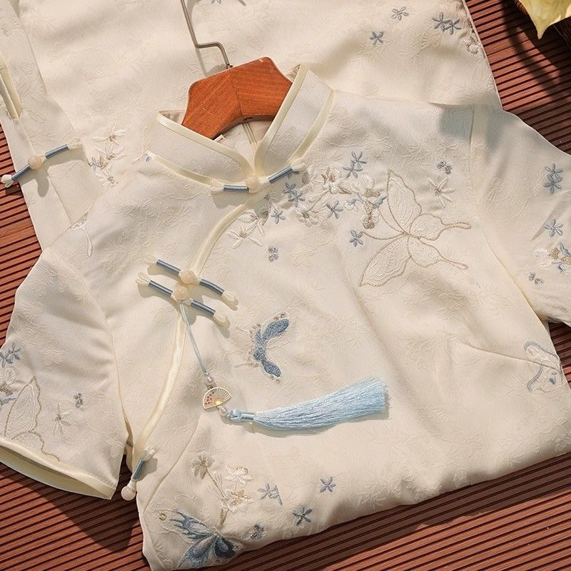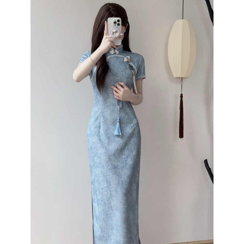 ブルー中国チャイナドレスロング中華民国スタイル夏改良された若い女の子2025文学的でエレガントな新しいハイエンド