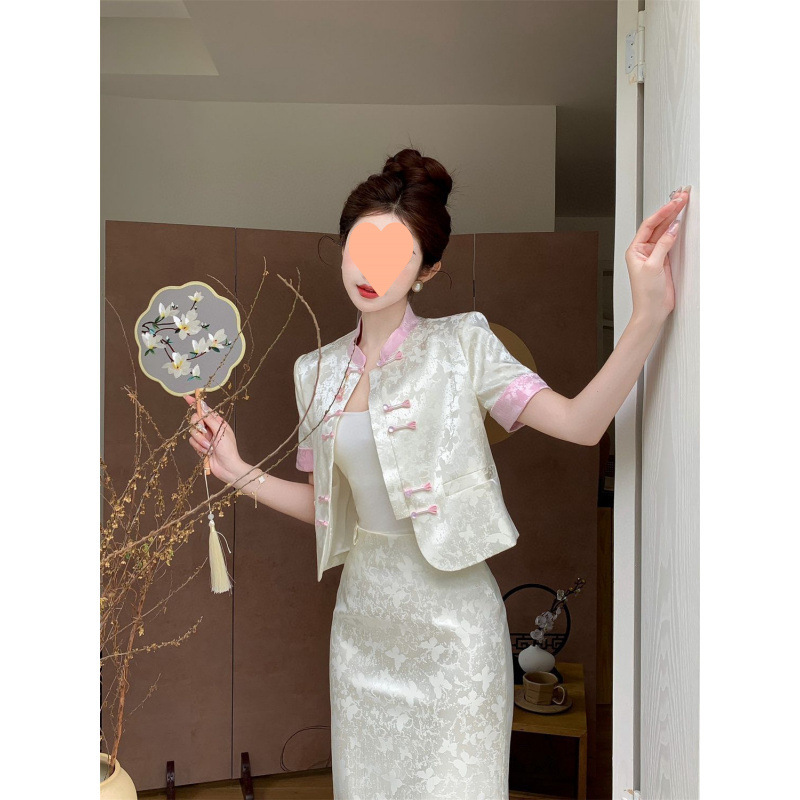 新しい中国風ジャカード半袖ボタン付きトップス夏のお腹カバースカートセレブ人気スーツ