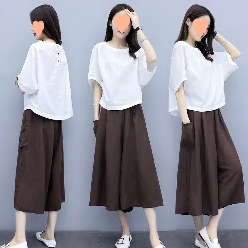 綿麻ファッションスーツ 2025 新しいツーピースセット大きいサイズルーズスリムワイドレッグパンツツーピースセット夏の婦人服