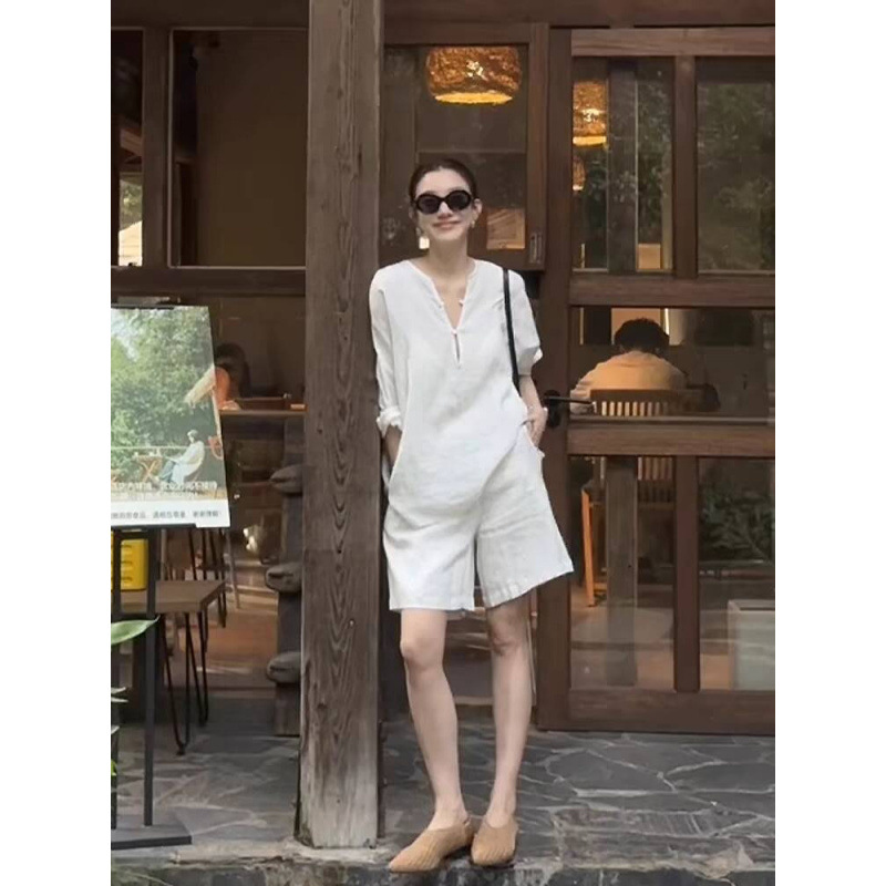 オールドマネースタイルの女性用白い綿とリネンのスーツ、夏休みの服装、カジュアルでリラックスした日焼け止めシャツとショーツの2点セット