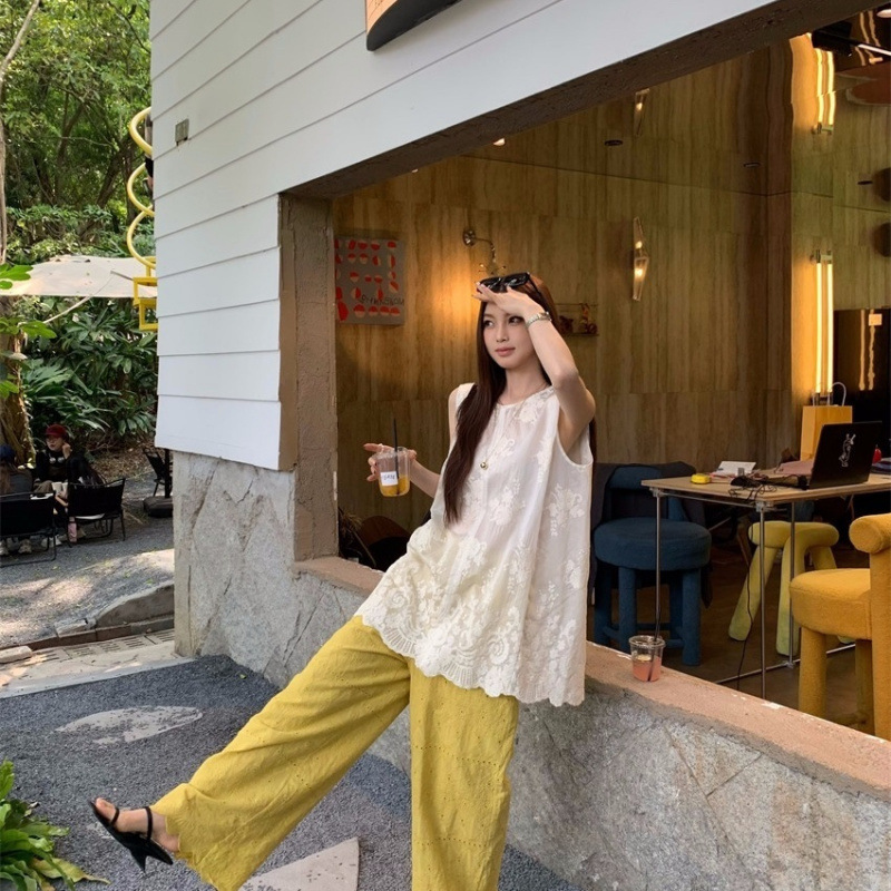 韓国風レースノースリーブトップ女性のための夏の2025新しいスリムで多用途な弾性ウエストワイドレッグパンツ2点セット