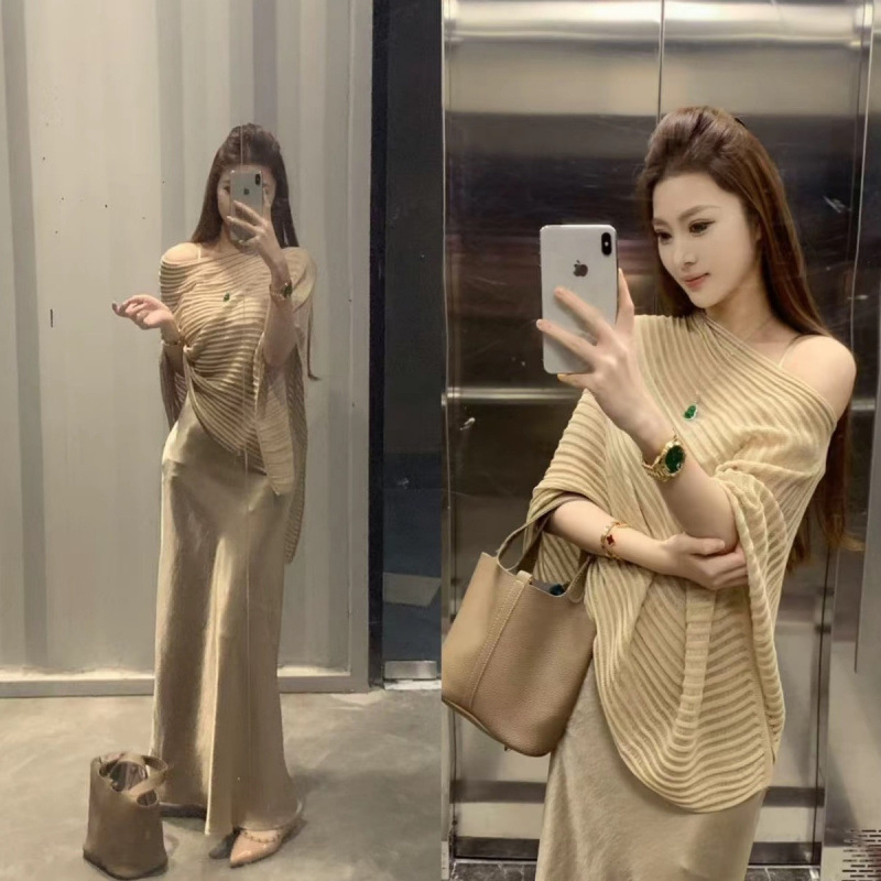 2025 新しい夏スタイルの怠惰な気質不規則な中空日焼け止めブラウス + サテンサスペンダーヒップドレス女性のための