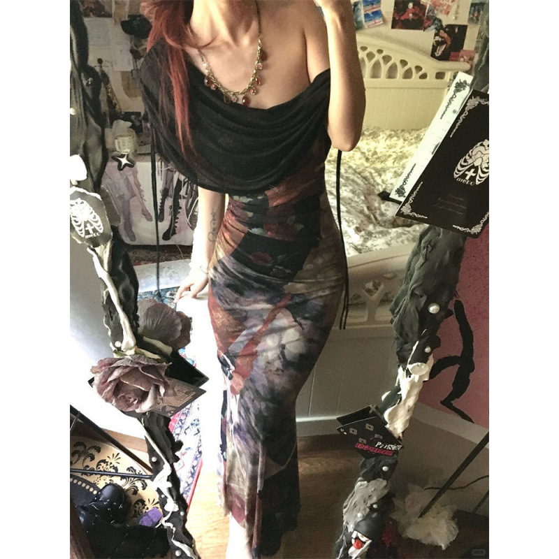 フレンチレトロな気質の花柄ワンショルダーリボンドレス女性の夏のウエスト痩身フィッシュテールヒップロングスカート
