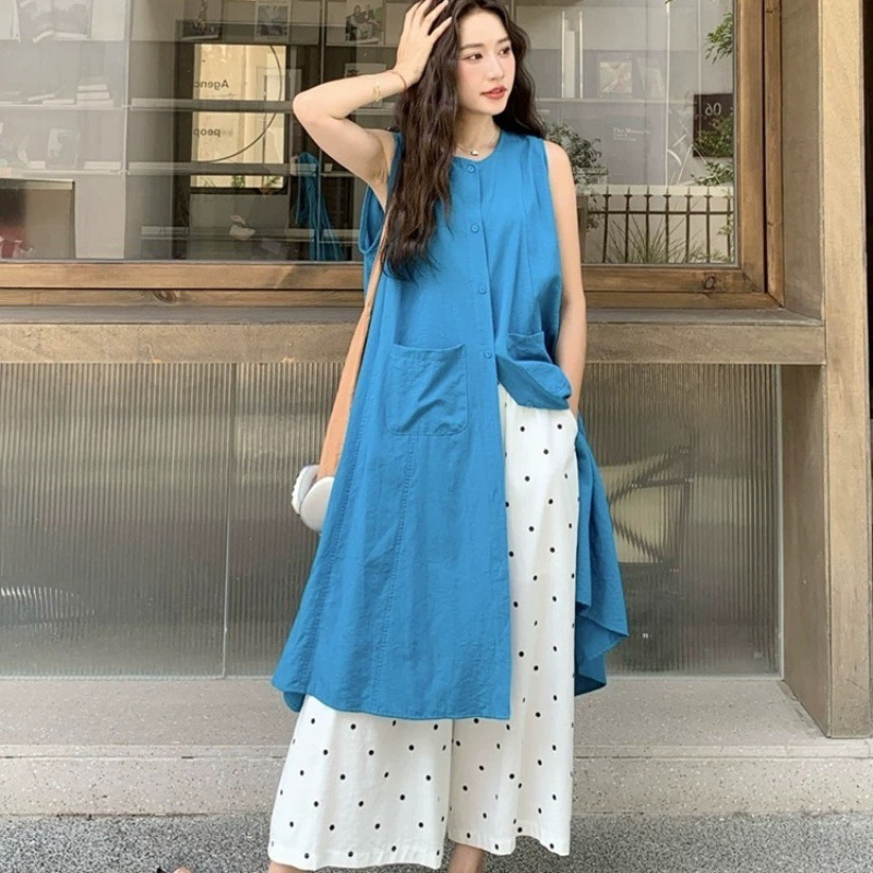 女性のための夏のリラックスした新鮮なスーツ 2025 新しいレイジースタイルカジュアルベストスカート水玉模様のワイドレッグパンツ 2 点セット