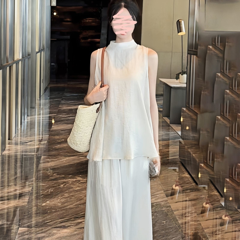 2025年新作夏スタイル禅スタイルハーフタートルネックノースリーブバックスリットトップとハイウエストパンツスーツオールドマネースタイル