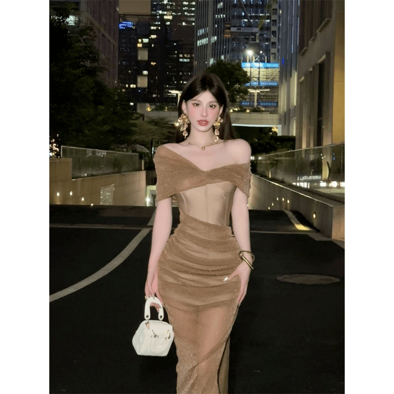 純粋な欲望のホットガールセクシーなワンショルダーチューブトップロングスカートニッチデザインカジュアルスリットチェック柄ウエストドレス