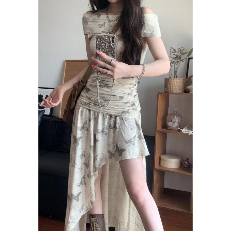 フレンチロマンチックなワンショルダー不規則な蝶プリントロングスカート女性の夏の気質デザインウエストドレス