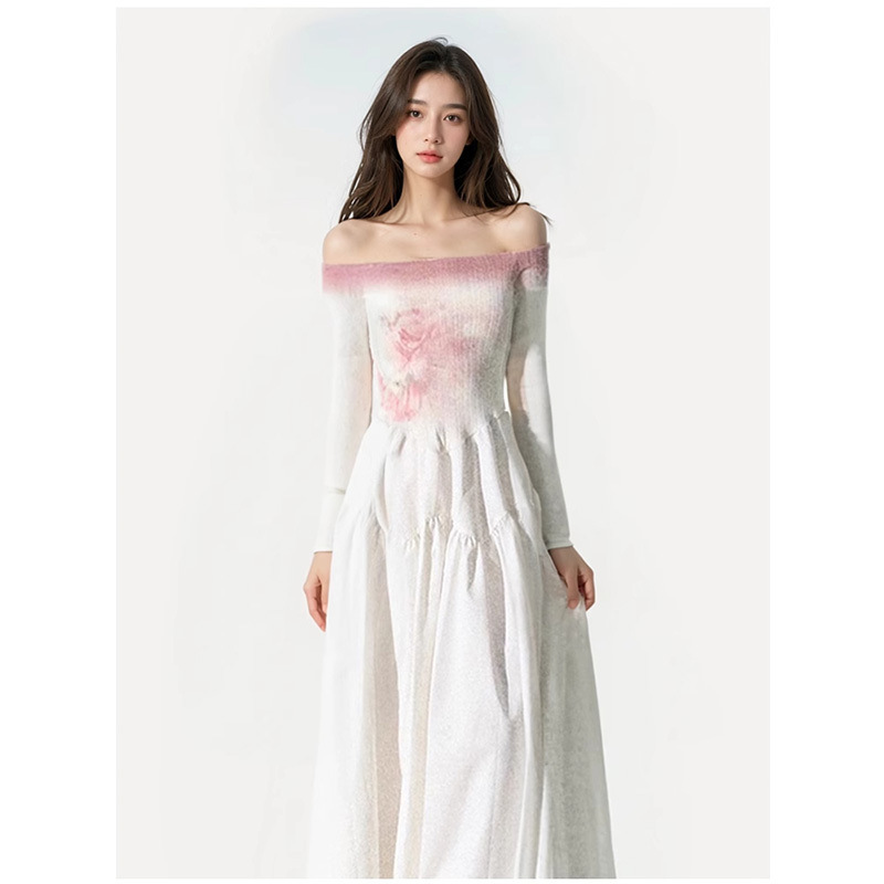 韓国の優しいスタイルのワンショルダーグラデーションスプライシングフラワードレス秋冬デザインスリムフィットロングスカート