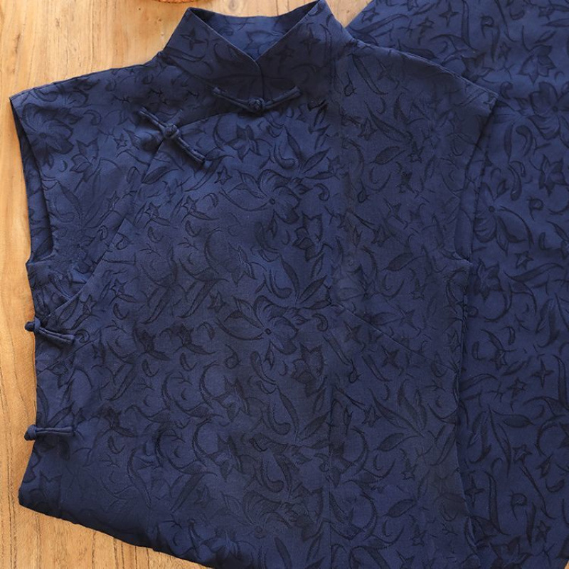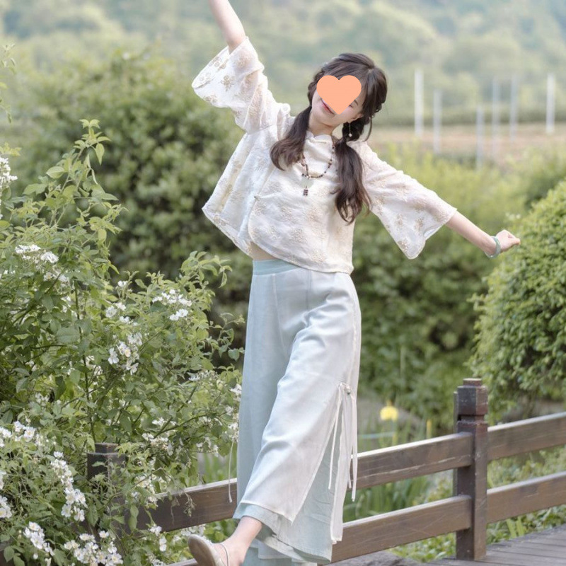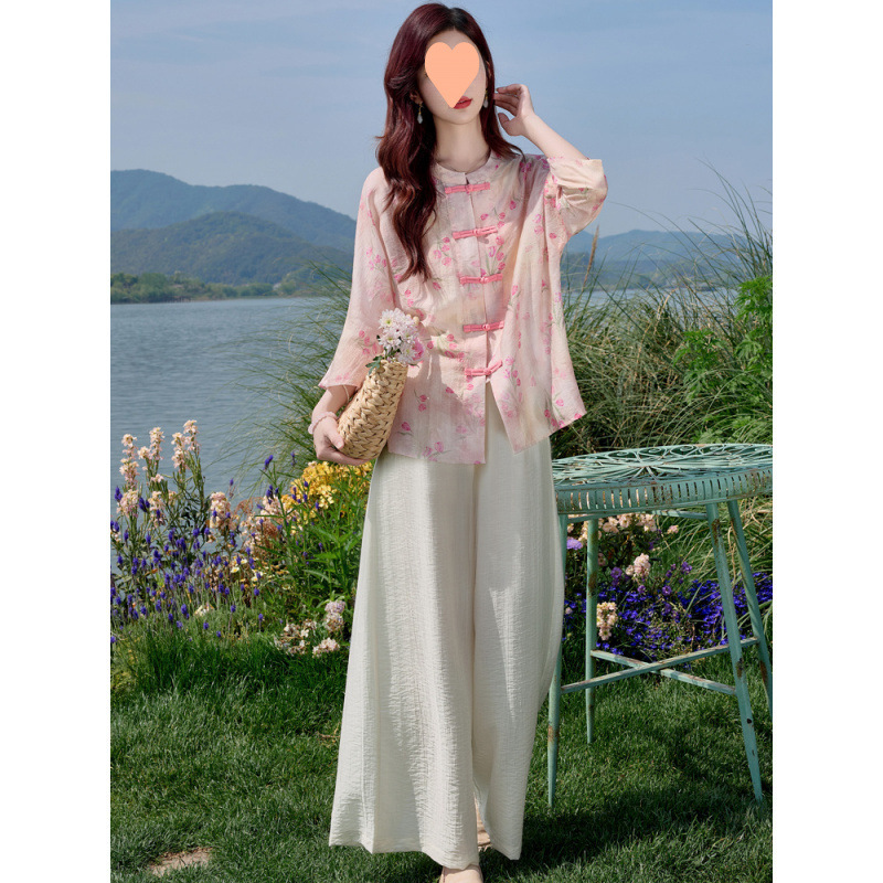 2025年春の新作チャイナトップ、国民風バージョン、文学的でレトロで爽やかな2点セット、改良されたデイリー2点セット