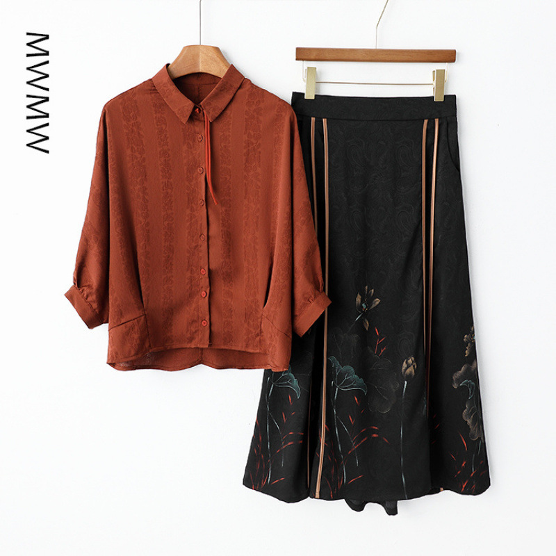 Xiangyunsha シルク年齢軽減ママサマースーツ中国風西洋スタイルロングスカートマルベリーシルクシャツトップツーピースセット