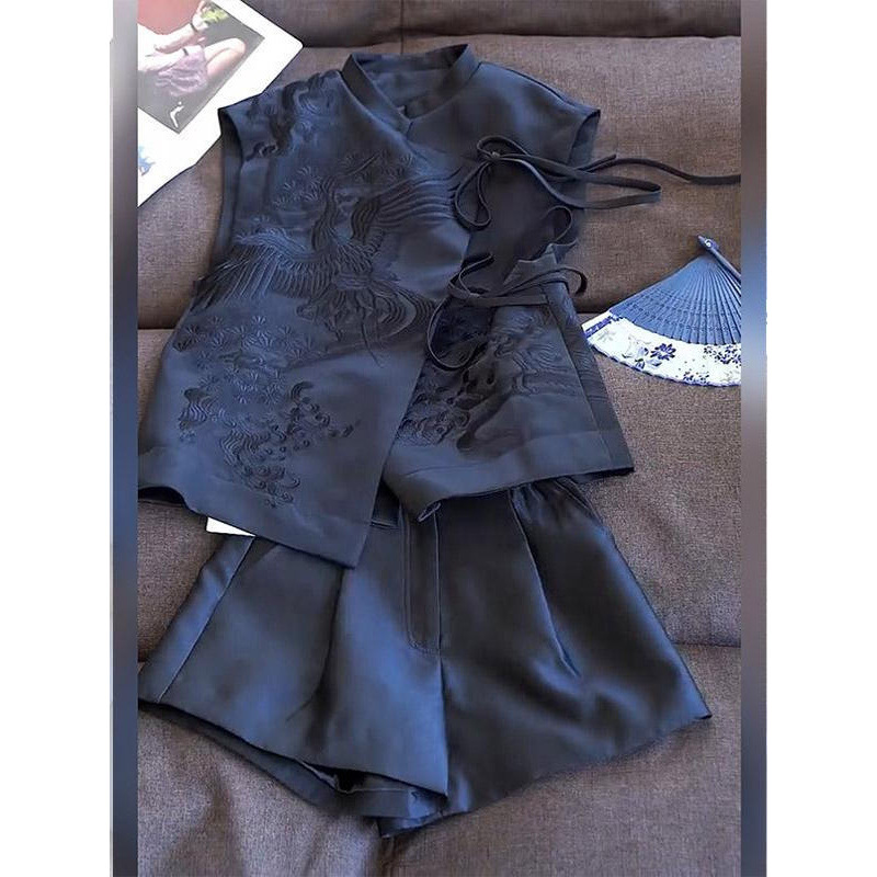 新しい中国風の文学と芸術のハイエンドチョッキ刺繍ベスト女性のための 2025 新しいファッションハイウエストレトロショーツツーピースセット春