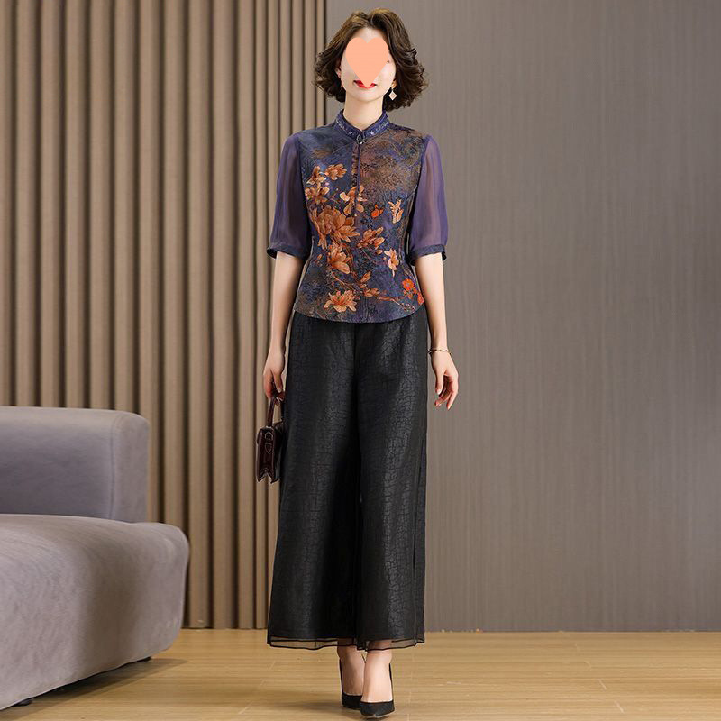 新しい中国風ママ夏シフォンスーツ、中高年女性向けのおしゃれなトップス、中高年女性向け夏半袖Tシャツ