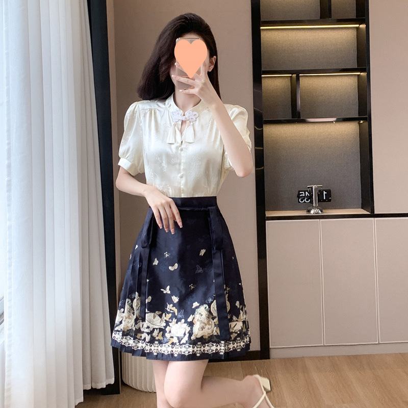 プラスサイズの新しい中国風の馬面スカートスーツ夏 2025 新しいファット MM 気質スリムジャカードシャツ 2 点セット