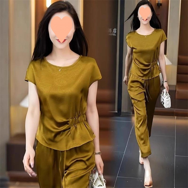 女性用高級アイスシルクスーツ、夏のファッショナブルな半袖Tシャツ、9点ハーレムパンツ2点セット